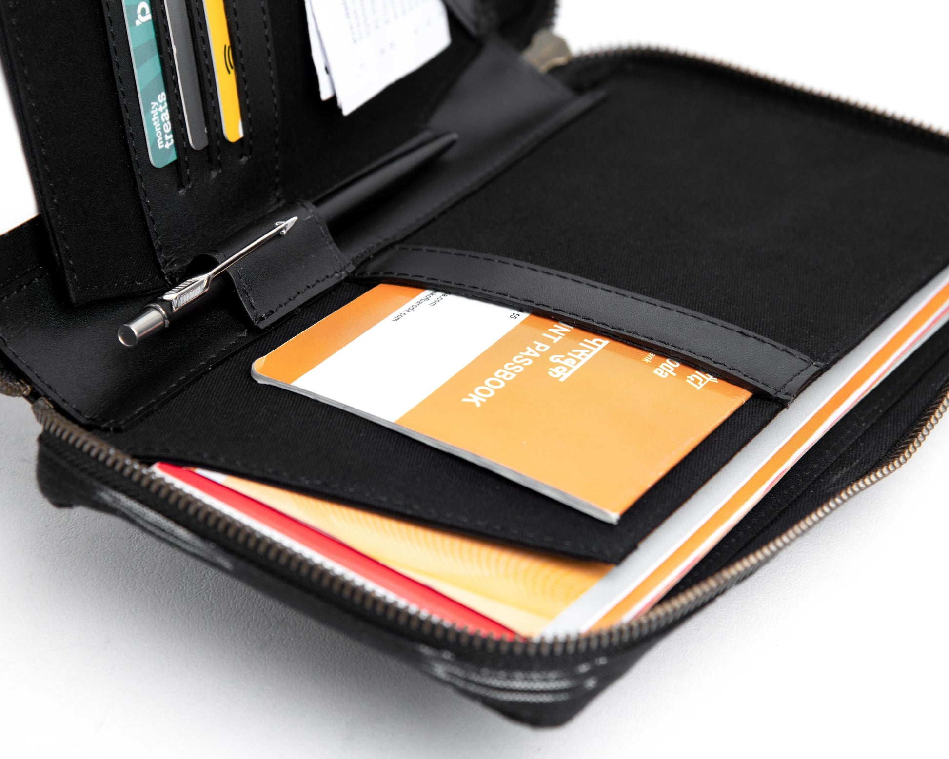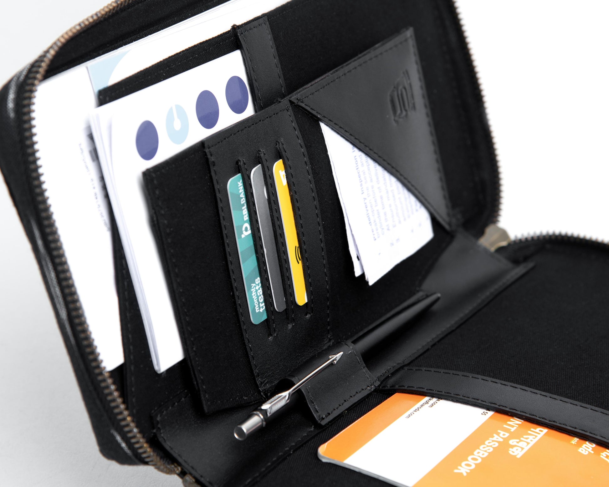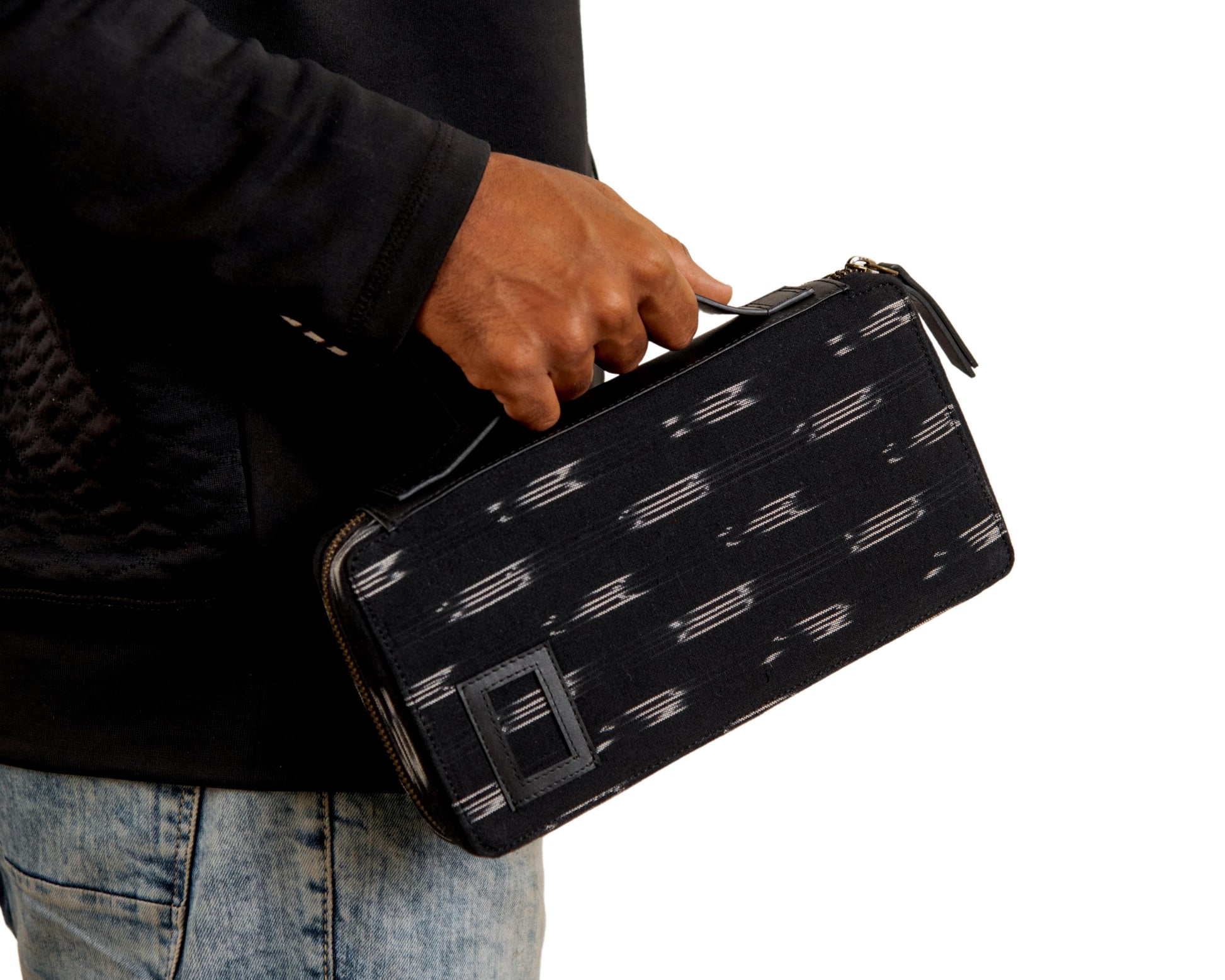 Bank Organiser is something where you keep all your bank related documents together. The organiser is made out of Genuine Leather and premium handwoven Black and White Ikat Supported by highly rich cotton Lining.